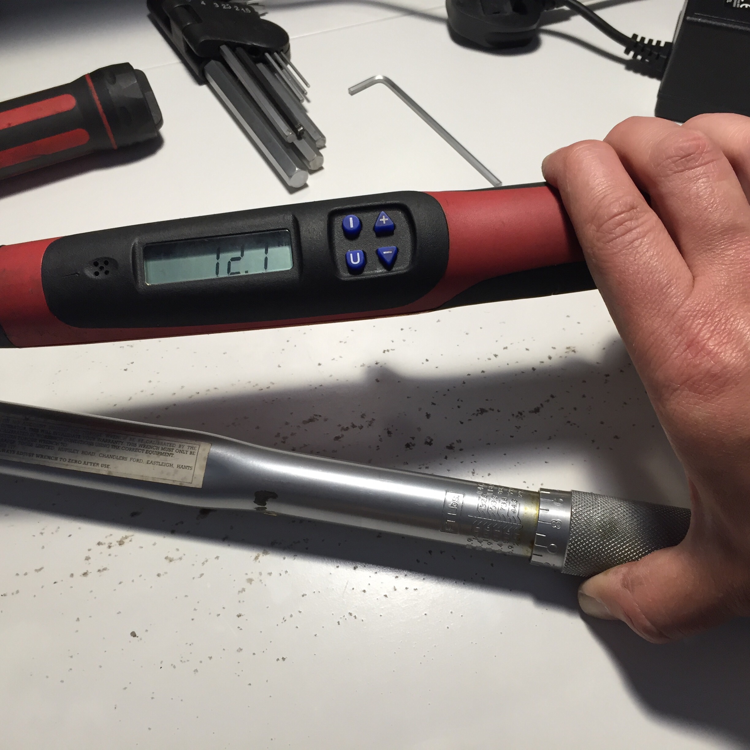 Problem: My old cheap Draper torque wrench was last used 7 years ago, and in that time I left it set to 40NM. Stoopid! Now I have no idea if it’s reading correctly and don’t want to risk snapping the studs on my head.